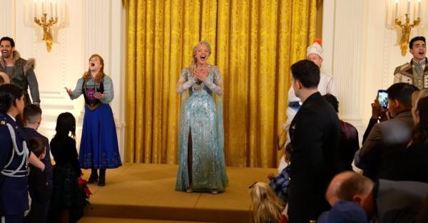 演员卡洛琳·鲍曼(艾尔莎)、劳伦·妮可·查普曼(安娜)、杰里米·戴维斯(奥拉夫)、多米尼克·多塞特(克里斯托夫)和普雷斯顿·佩雷斯(汉斯)受到第一夫人吉尔·拜登的欢迎,共同庆祝白宫节日装饰的揭幕。国民警卫队的家庭首先看到了这些装饰,然后观看了《冰雪奇缘》的表演。