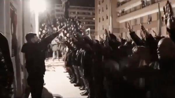 视频显示,人群举起手臂,做出纳粹式的僵硬敬礼,并高呼“在场!”在已不复存在的新法西斯主义意大利社会运动党(MSI)的前总部前。一个象征白人至上的凯尔特十字也在展出。