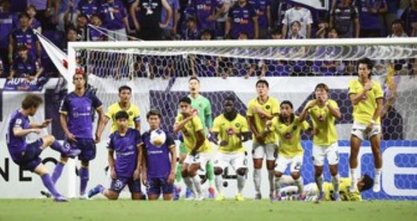 2024年9月19日,广岛,在广岛Edion和平翼举行的ACL2足球比赛中,Kaya FC-Iloilo球员(黄色)防守任意球。(图片由亚足联提供)(共同社)